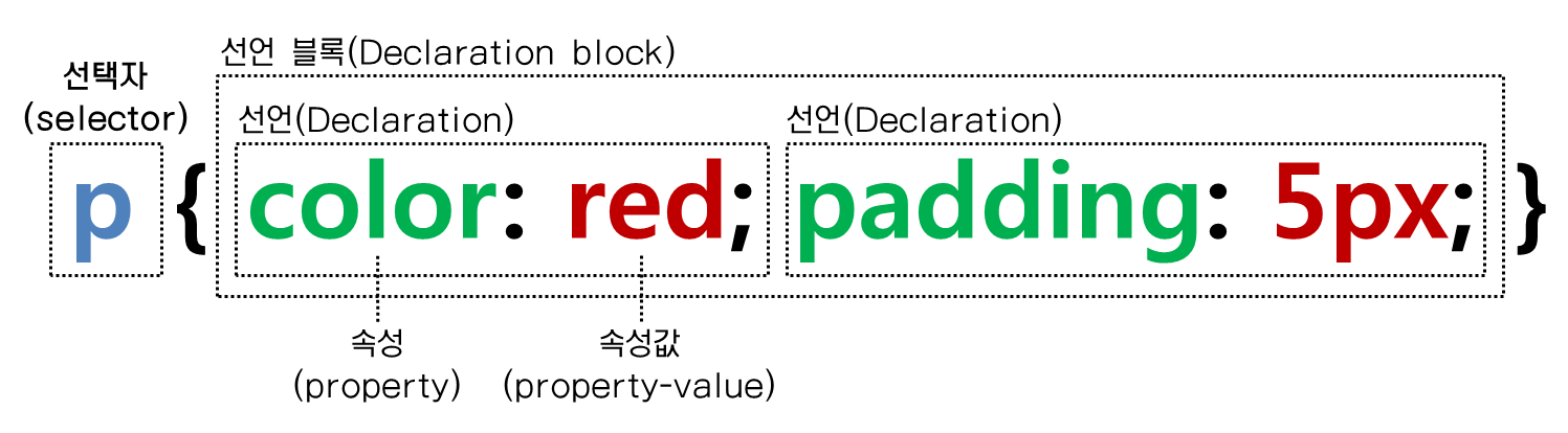 어떤 태그를 디자인하기 위해서는 디자인하려는 태그를 선택하고 (선택자) 선택한 대상에게 효과를 줘야 합니다. (선언) 이번 시간에는 CSS에서 가장 기본적인 문법이라고 할 수 있는 이 선택자